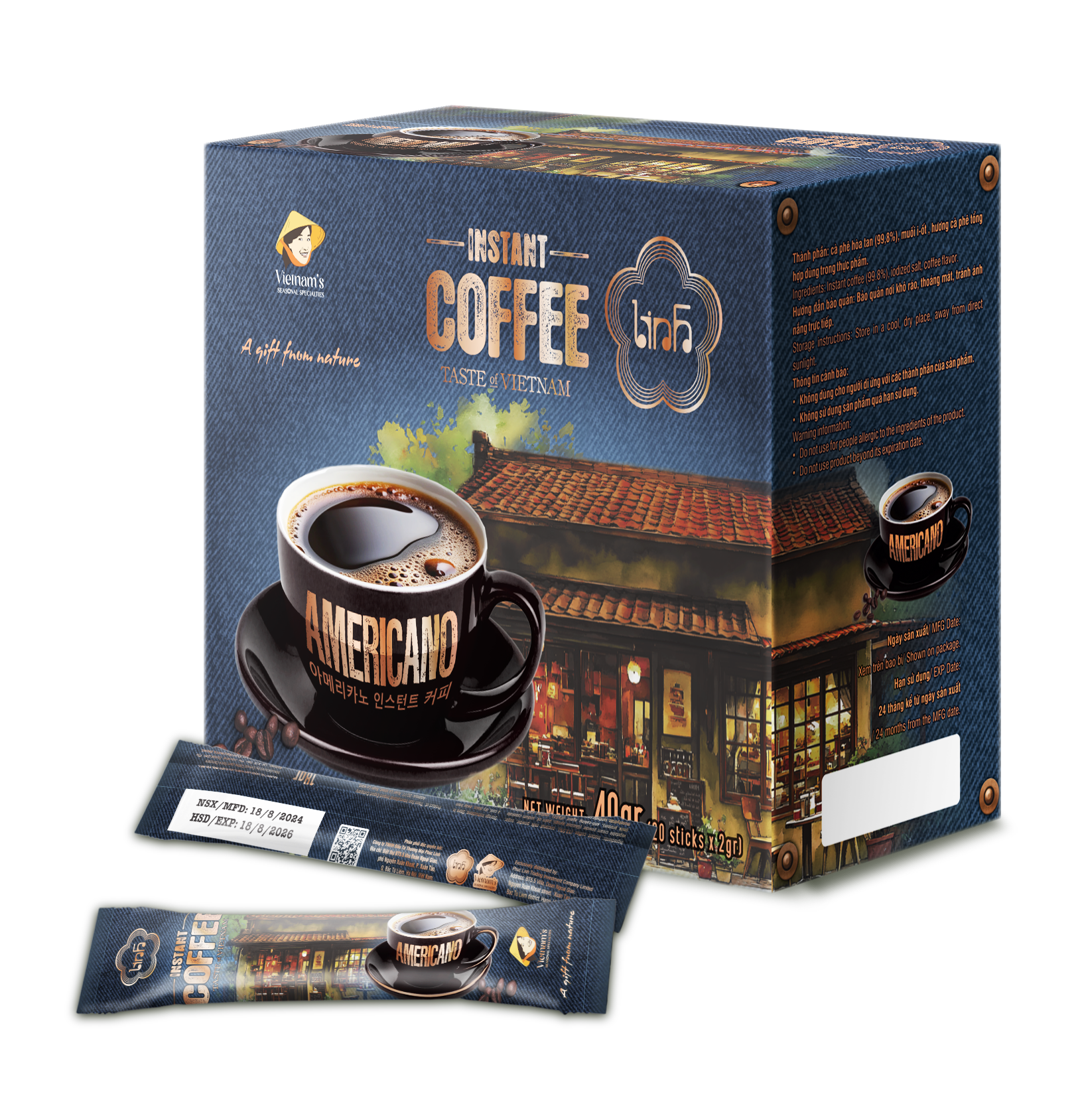 • Thành phần: cà phê hòa tan (99,8%), muối i-ốt, hương cà phê tổng hợp dùng trong thực phẩm.