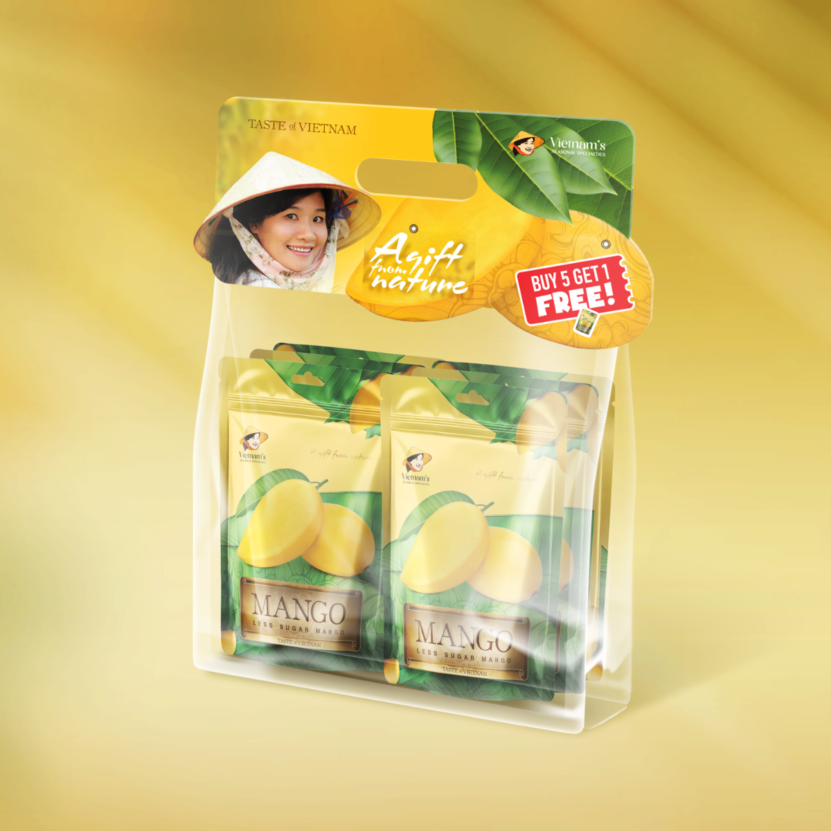 • Bao bì được thiết kế hấp dẫn với hình dáng trái xoài, sử dụng vật liệu và cách thức in ấn đặc biệt tạo nên dáng vẻ hấp dẫn và khả năng nhận diện từ xa.